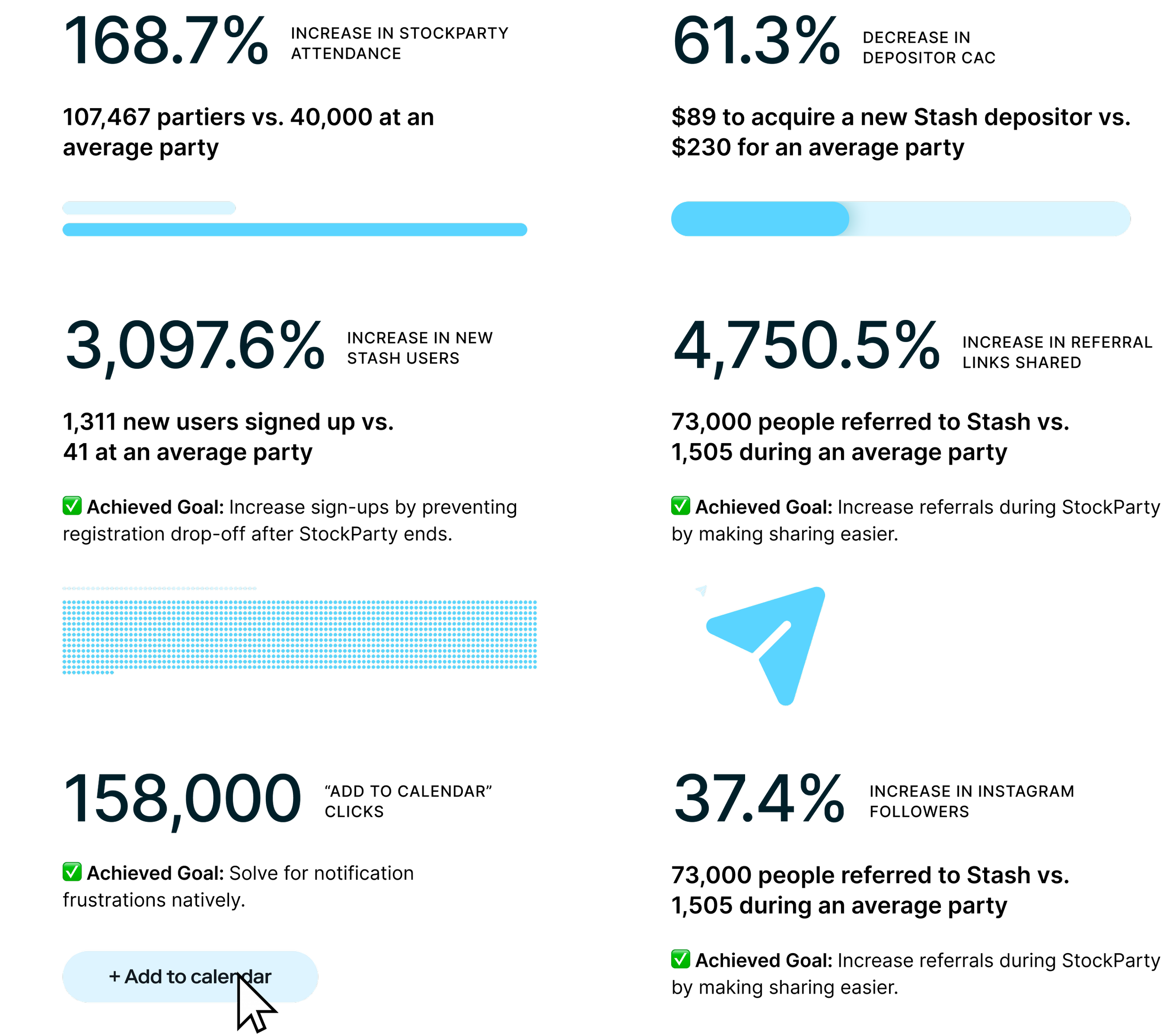 The “Get Stocked with Stash” campaign and product updates successfully achieved our goals and put Stash StockParty back on the map for existing and new users. These results compare the average numbers from the 4 campaign days against the metrics for an average Stash StockParty.